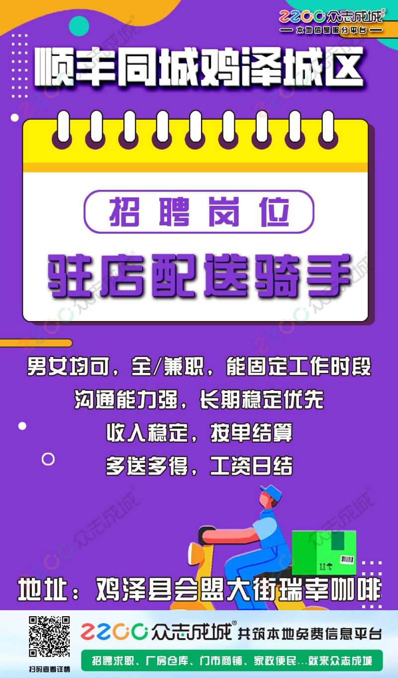 【招聘岗位】顺丰同城鸡泽城区外卖骑手