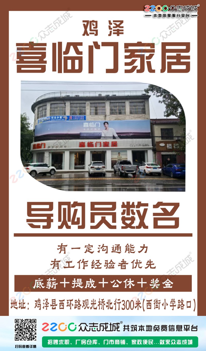 鸡泽喜临门家居现招聘导购员数名,薪资待遇(底薪+提成+公休+奖金)要求仪表端庄,有一定沟通能力,有工作经验者优先。 地址:鸡