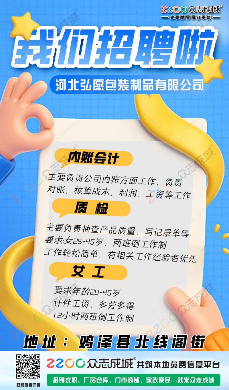 河北弘愿包装制品有限公司招聘:质检,主要负责抽查产品质量,写记录单等,要求:女25-45岁,两班倒工作制,工作轻松简单,有相关工作经验者优先。