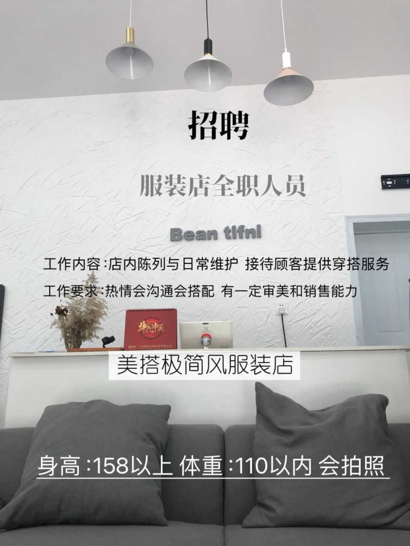 美搭极简风服装店招聘销售(最好销冠),要求:必须有工作经验及审美销售能力,身高:160左右,体重:110斤以下,会拍照,工资面议,地址:民生东路信用社旁边,电话:
