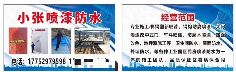 小张喷漆.防水 承接各种厂房民房彩钢翻新,大门喷漆,大门改中式,小区入户门翻新改色,钢构防腐,路面改色,屋顶防水,外墙防水,卫生间阳台防水,阳光房搭建,旧房改造,