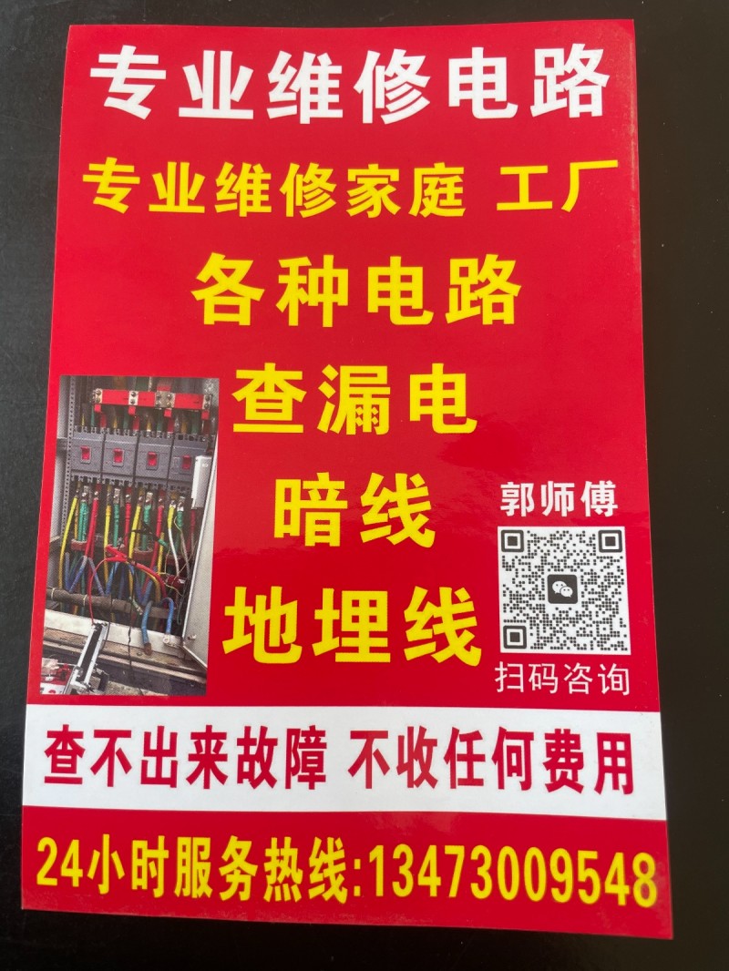 专业维修家庭、工厂各种电路,查漏电、暗线、地埋线!24小时服务热线