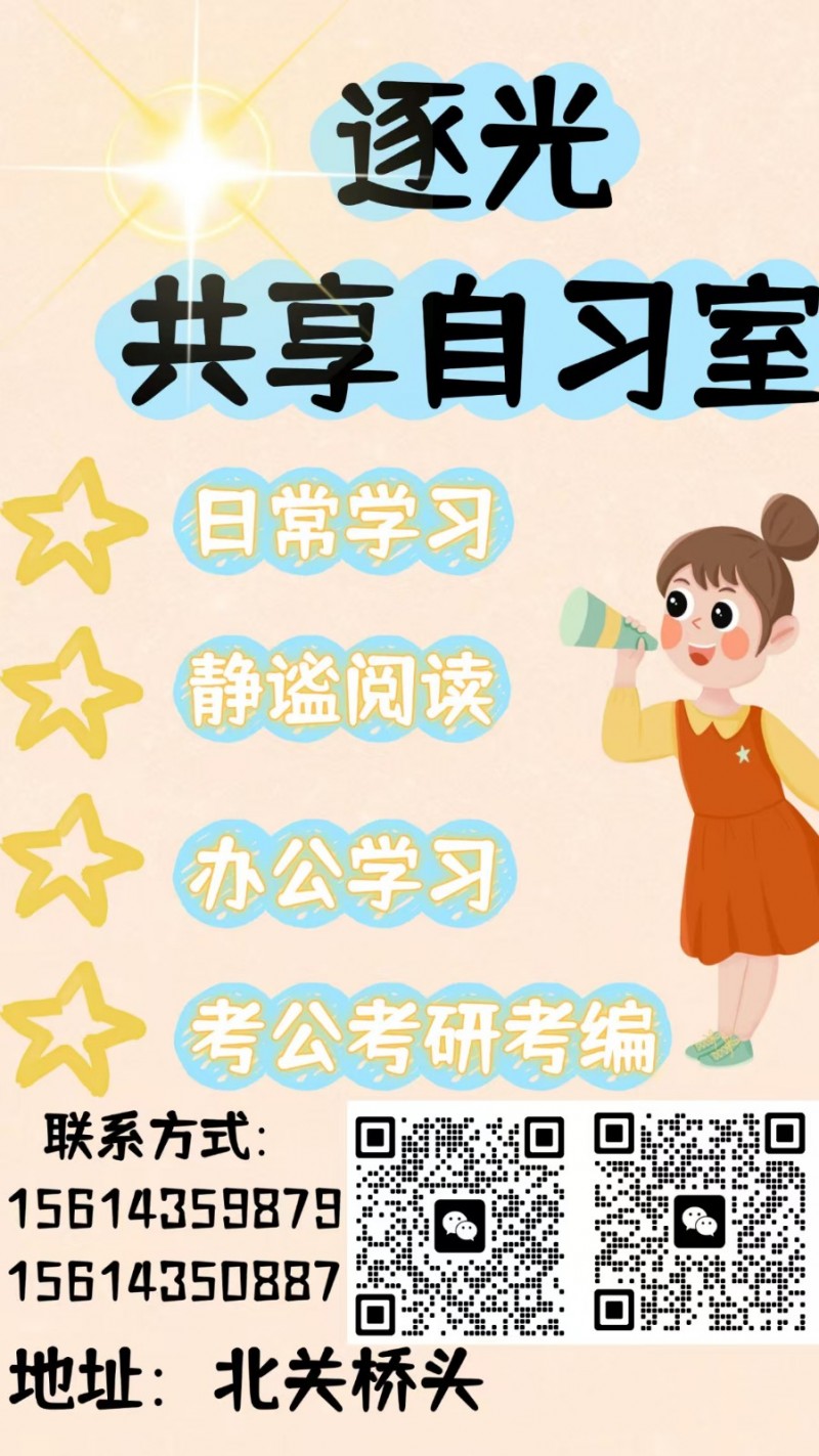逐光共享自习室|开业福利!为追梦人点亮备考之路[庆祝][庆祝][庆祝][庆祝][庆祝] 还在为考公、考研、考编找专属学习地?想远离喧嚣,沉浸式投入学习?逐光共享自习室盛大开业,承包你的备考时光![加油][加油][加油][加油] 沙阳、韩固、北关、西营、东营的小伙伴有福啦!门店就在北关桥头,离家超近,省去通勤烦恼,抬脚就能奔赴学习战场~不管是日常刷题,还是长期备考,这里都是你的理想之选! 更贴心提供住宿服务,家远或想全身心冲刺的伙伴,无需奔波,住学一体超方便!自习室内环境安静整洁,茶水饮料无限供应,打印机等学习设备齐全,全方位满足备考需求,让你专注学习无顾虑~ 告别拖延,结伴追梦!赶紧约上战友,来逐光抢占专属学习位~ 地址:北关桥头 联系电话:/(同微信) 逐光等你,一起奔赴理想未来![加油][加油][加油][加油][庆祝][庆祝][庆祝][庆祝]