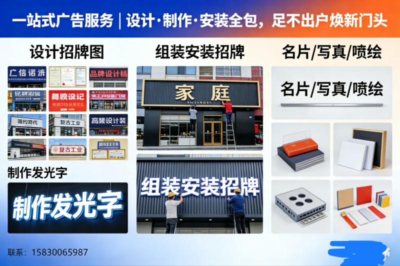 贺鑫广告 全品类广告服务:招牌设计制作安装、发光字定制,名片/写真/喷绘全覆盖,一站式包办,足不出户轻松换好新门头。