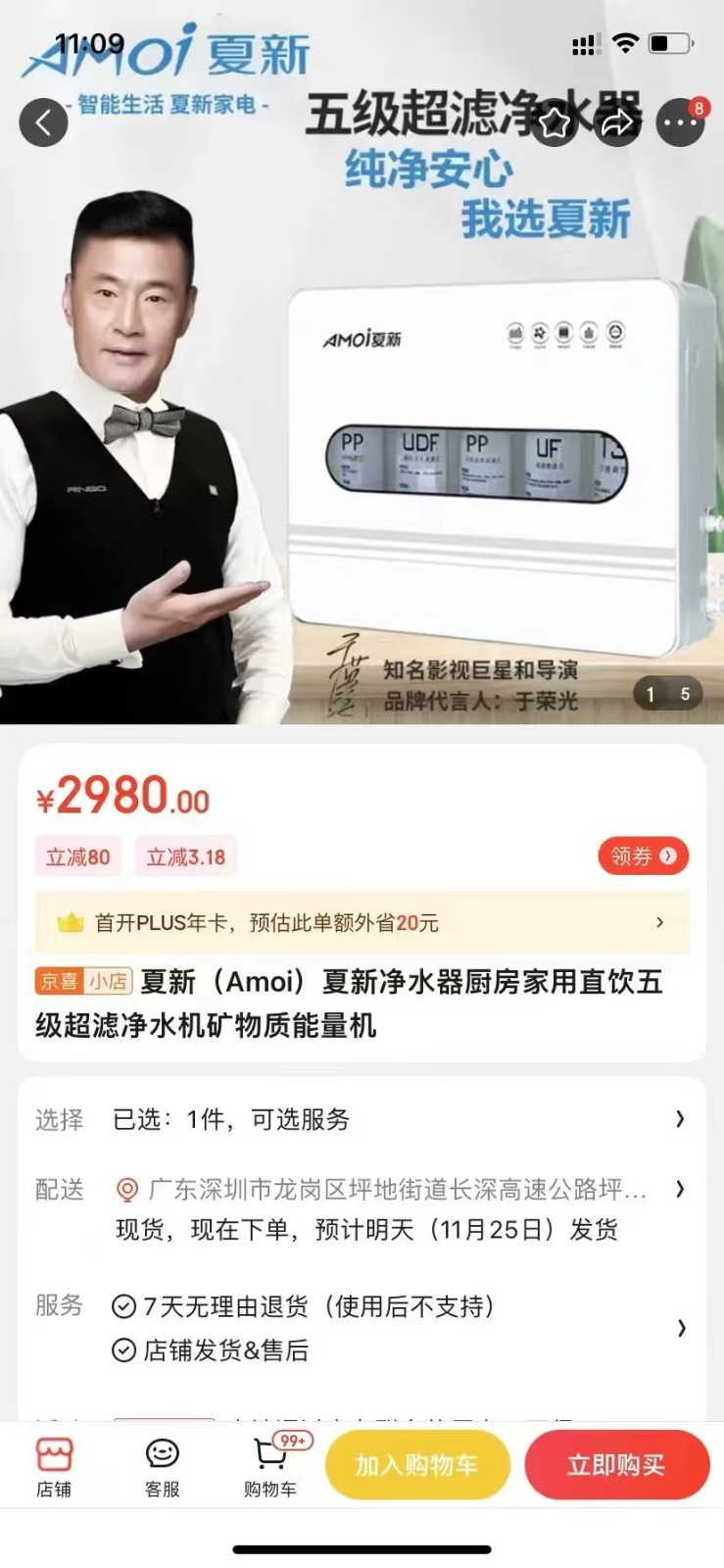夏新净水机,库存新机,京东售价2980,现在仅需299,全国包邮质保一年。