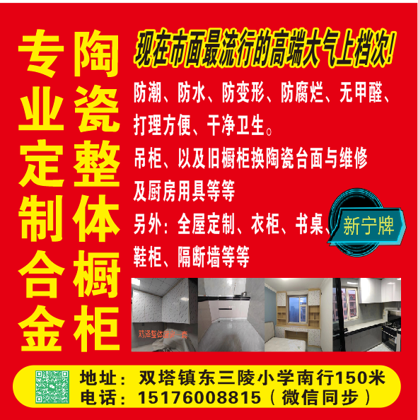 新宁牌合金陶瓷整体橱柜,专业定制现在市面上最流行的一款高端大气上档次、真正做到防潮、防水防腐烂、防变形、无甲醛,干净卫生、打理方便、可以用水冲洗。销售抽烟机、燃气灶、热水器?太阳能、等等!改装水电等维修:主要维修各种橱柜,旧橱柜换门、换陶瓷台面等等…另外全屋定制:吊柜、衣柜、鞋柜、书桌书架书柜等等…地址:双塔镇东三陵小学南行150米即到。