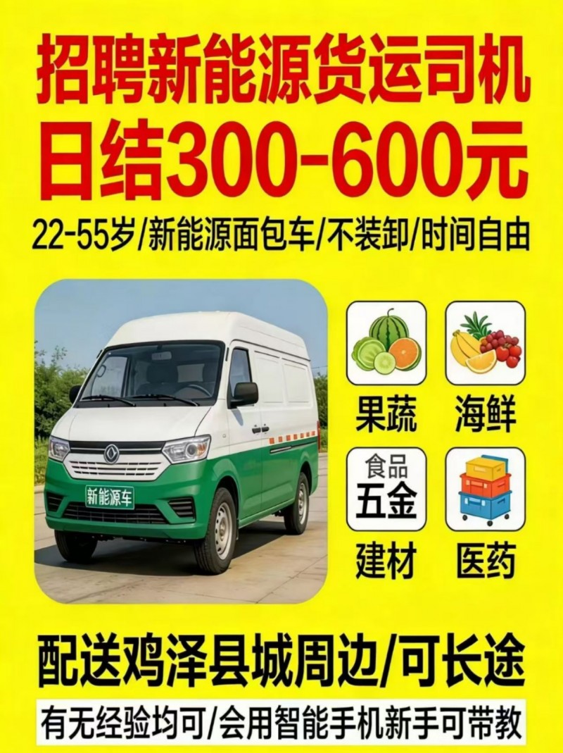 金诚新能源汽车招聘职位:货运司机要求:22-55岁,待遇:日结300-600元,不装卸,时间自由地址:鸡泽县城
