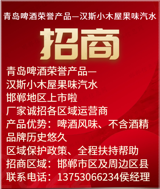青岛啤酒荣誉产品—汉斯小木屋果味汽水,邯郸地区上市啦,厂家诚招各区域运营商