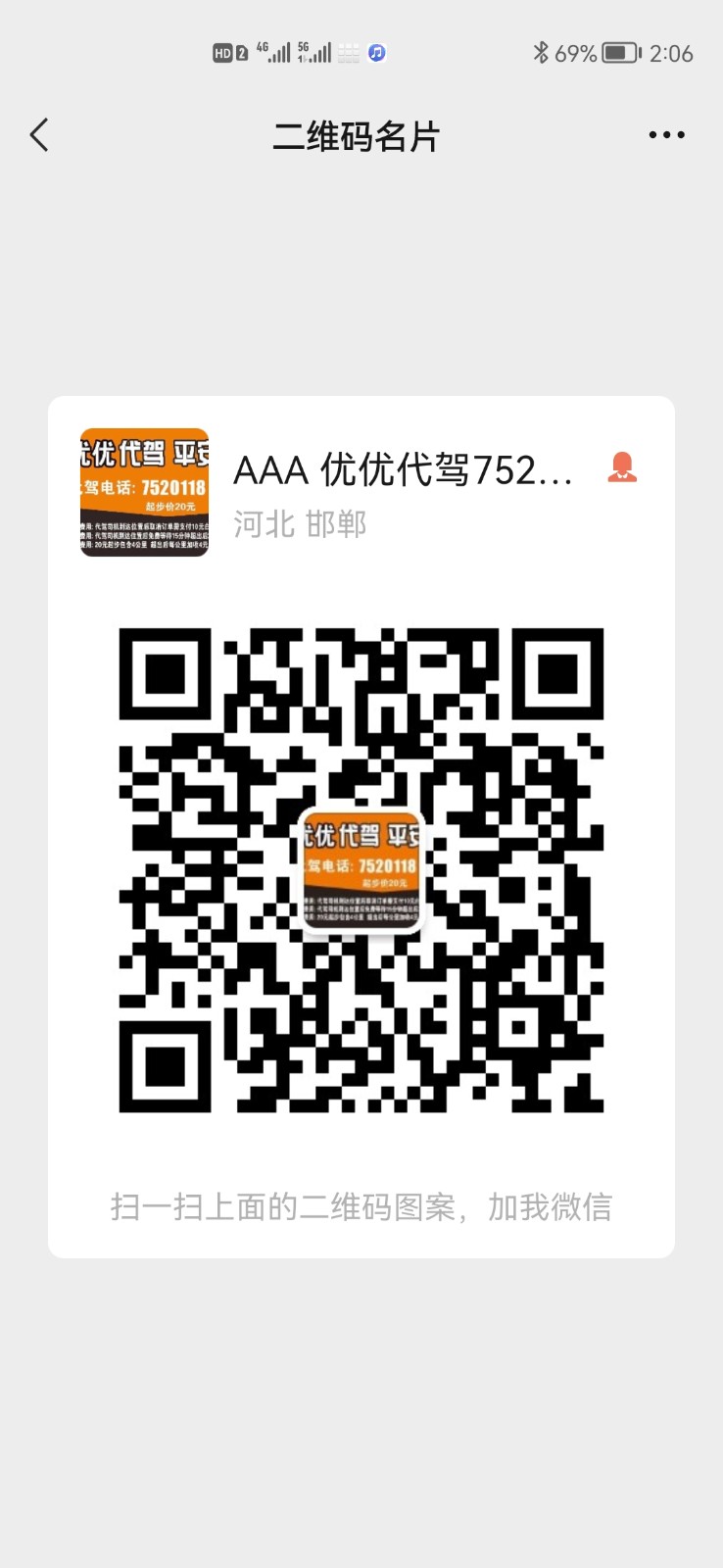 鸡泽优优代驾待各位老板的加入,我们的服务宗旨是,如果您当前叫的代驾等待时间长,您可以尝试联系一下我们优优,咱们优优以服务好每一位老板为荣,我们会以最快的速度接驾,不耽误您一分一秒,扫一扫加我好友
