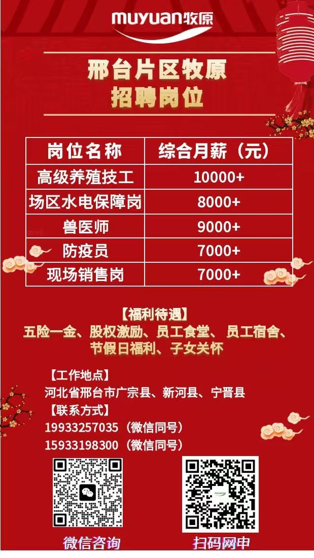 广宗牧原招聘:高级养殖技工 薪资:10000+,五险一金,月休4天,提供住宿