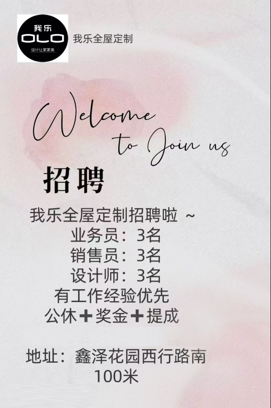 我乐全屋定制招聘啦 ~设计师:3名有工作经验优先 工资:公休➕奖金➕提成地址:鑫泽花园西行路南100米