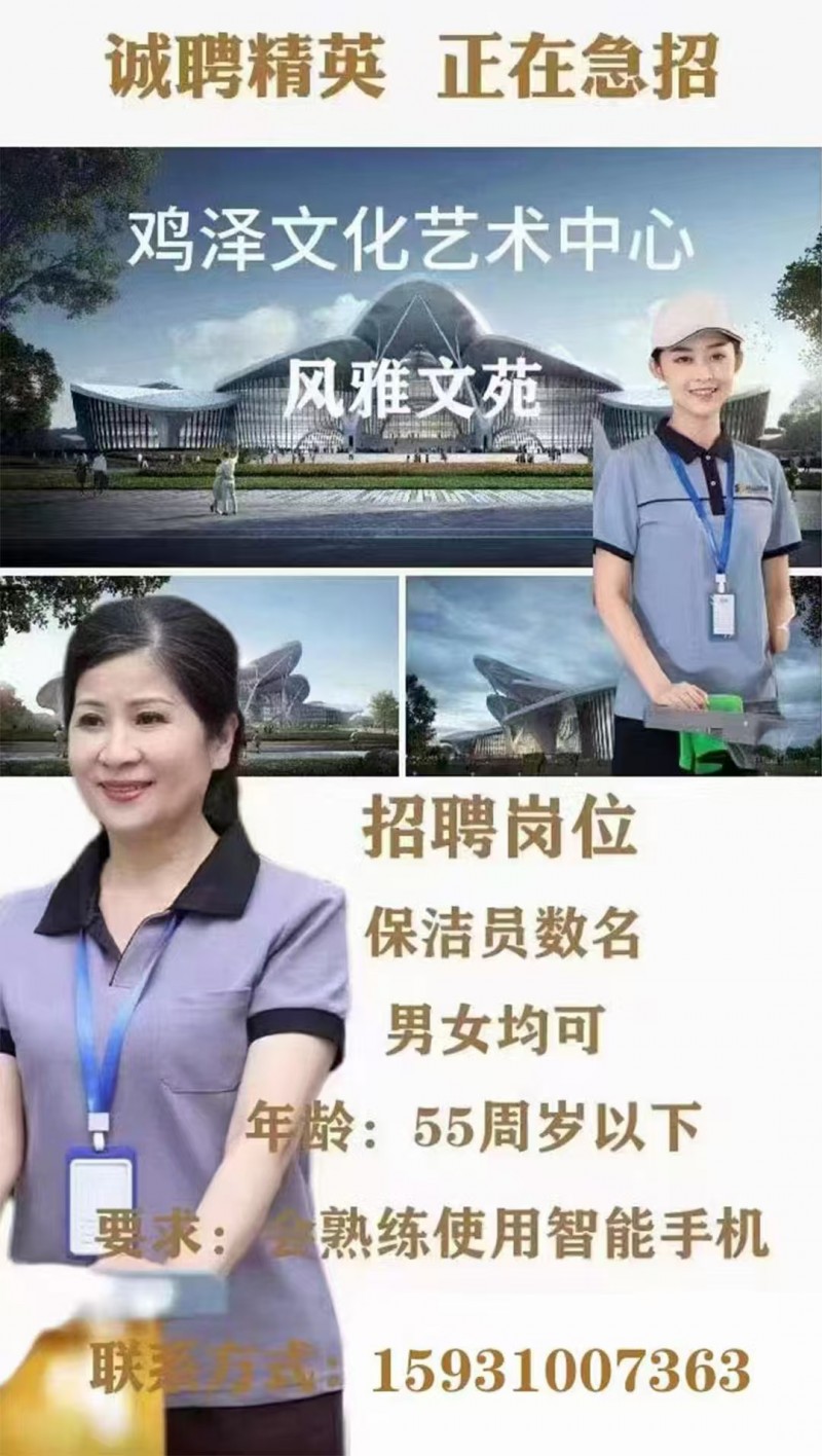 鸡泽县文化艺术中心风雅文苑小区招聘保洁员数名,男女均可,年龄55周岁以下,要求熟练使用智能手机