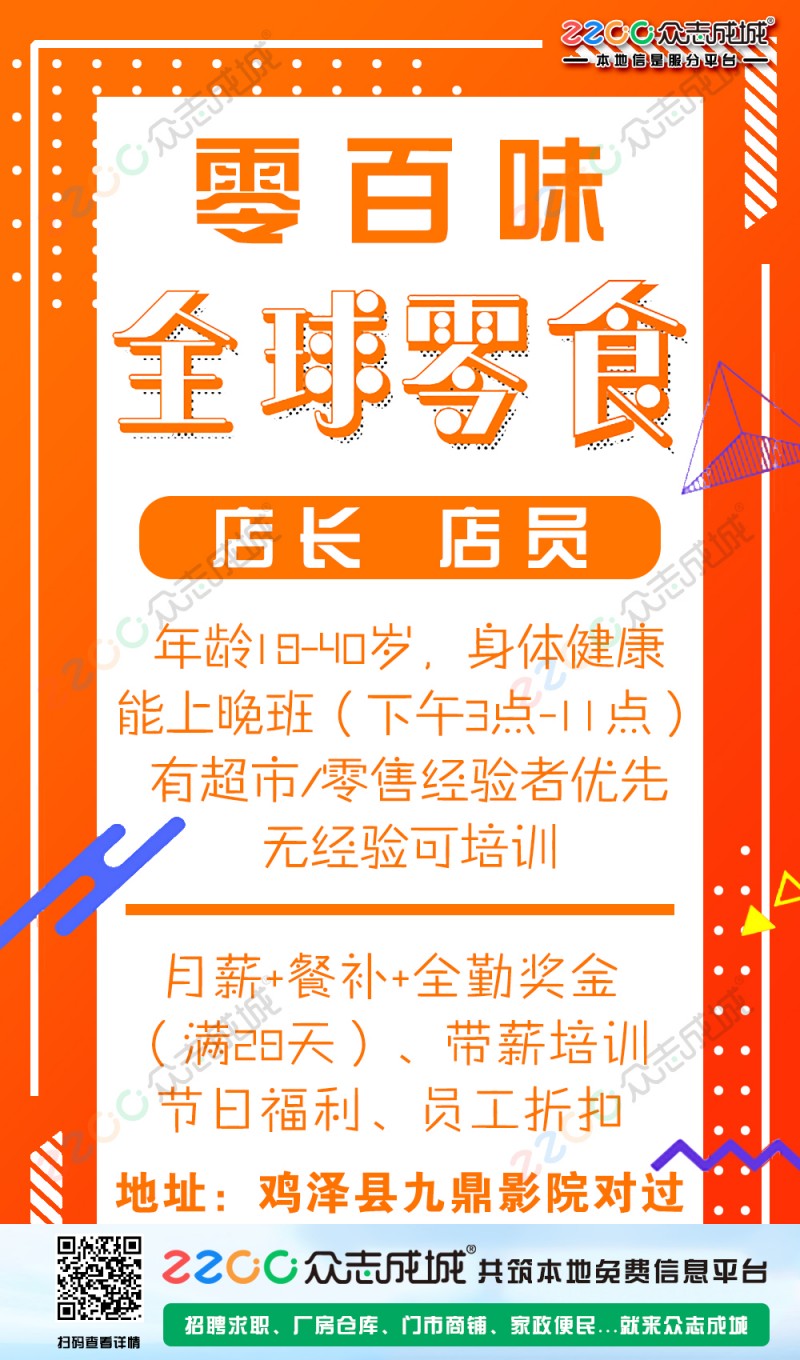 零百味全球零食招聘:店长1名,年龄18-40岁,身体健康,能上晚班(下午3点晚上11点)有超市/零售经验者优先,无经验可培训;性格
